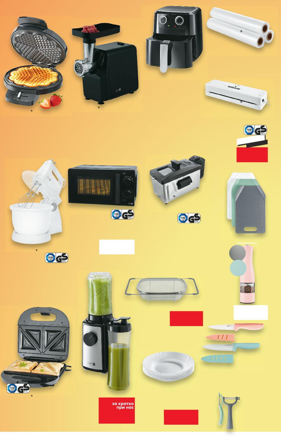 Цените са валидни за посочените на последна страница хипермаркети. Стоките се продават в количества, обичайни за едно домакинство. Всички цени са в лева с включен ДДС. Всички артикули се предлагат без декорация. Снимките са примерни. 139,90 79,99 49,99 59,99 34,99 29,99 12,99* 10,99* 15,99* 1,99* 12,99* 89,95 69,99 18,99 11,99* 6,99* 89,99 44,99 -50% 3 броя 6 броя 1 119,90 -33% 79,99 -37% 109,90 -45% 39,99 -12% 179,90 -50% 21,99 -13% Керамичен нож 16 см 10 см Блендер TB-B0201 300 W Комплект чинии основни Ø25 см, дълбоки Ø23 см, или десертни Ø20 см Комплект дъски за рязане Фритюрник с горещ въздух FA-5053 1400 W Месомелачка MG-B0201 различни приставки,