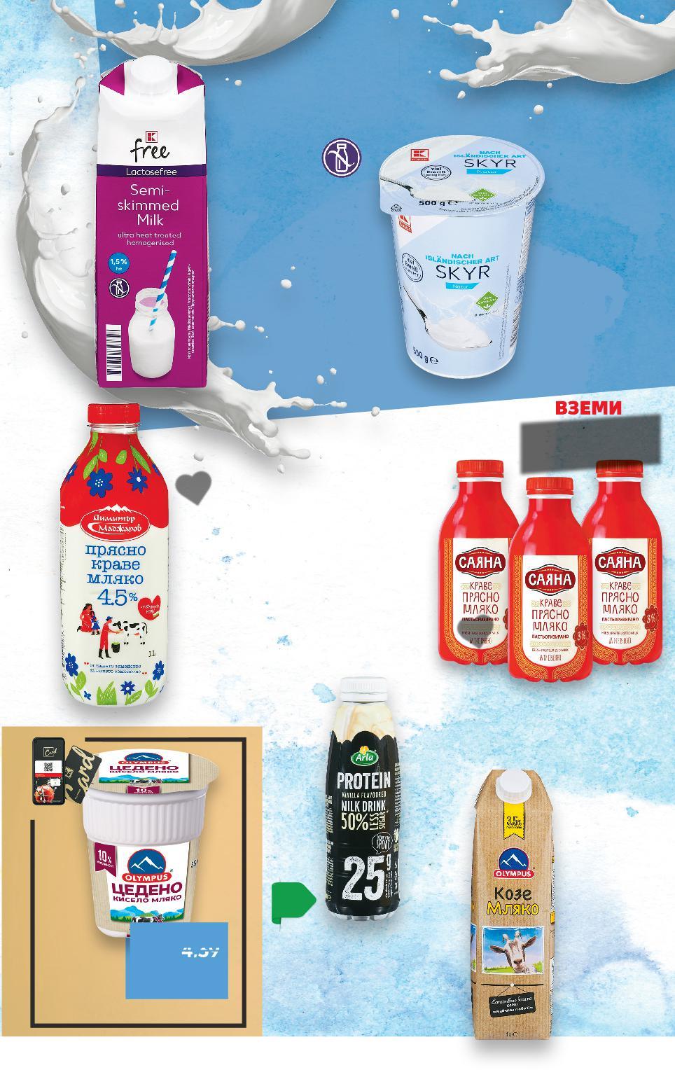САЯНА Кисело мляко по БДС 3,6% масленост 400 г (1 кг = 2,73) ПРОМОПАКЕТ ПРОМОПАКЕТ Цените са валидни от 06.03.2023 до 12.03.2023 или до изчерпване на наличностите. Стоките се продават в количества, обичайни за едно домакинство. Всички цени са в лева с включен ДДС. Цените са валидни за посочените на последна страница хипермаркети. Kaufland не носи отговорност за печатни грешки. Всички артикули се предлагат без декорация. Снимките са примерни. Предложенията може да видиш и