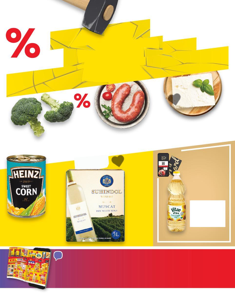 ИНФОРМИРАЙ СЕ ЗА KAUFLAND ИЗГОДНИТЕ ЦЕНИ И ВЪВ VIBER АБОНИРАЙ СЕ ЗА НАШАТА СЕДМИЧНА БРОШУРА Плодов и цветист аромат 9,99 само -53% 7,49 15,99 -36% 3,49 5,49 -34% 2,29 3,49 -38% 10,99 17,99 -25% 2,99 с3,99 3,99 амо 3 литра ДО 12 БРОЯ НА ПОКУПКА** **При покупка над 12 бр. всеки следващ продукт се продава на стандартна цена. В Kaufland може да платиш с: При въпроси: 0800 / 12 220 (Национален безплатен клиентски телефон), пон. – пет. 08:00 – 18:30. Стоките се продават в количества, предназначени за домакинството. *Със звездичка са обозначени артикулите, които са специално предложение до изчерпване на наличностите. Kaufland не носи отговорност за печатни грешки. Всички Kaufland Card отстъпки са изчислени спрямо стандартната текуща цена, на която продуктът се предлага в хипермаркета Суров Петрохан за сушене и печене от прясно свинско месо с чубрица, черен и червен пипер кг (1 кг = 9,99) SUHINDOL Червено или бяло вино различни сортове Произход: България, Дунавска равнина 3 л BiB (1 л = 2,50) Броколи Клас: I 500 г в опаковка (1 кг = 6,98) Сирене от краве мляко кг (1 кг = 10,99) HEINZ Сладка царевица 400 г (1 кг = 5,73) VITAE D‘ORO Олио слънчогледово 1 л (1 л = 2,99) Цена с KAUFLAND CARD