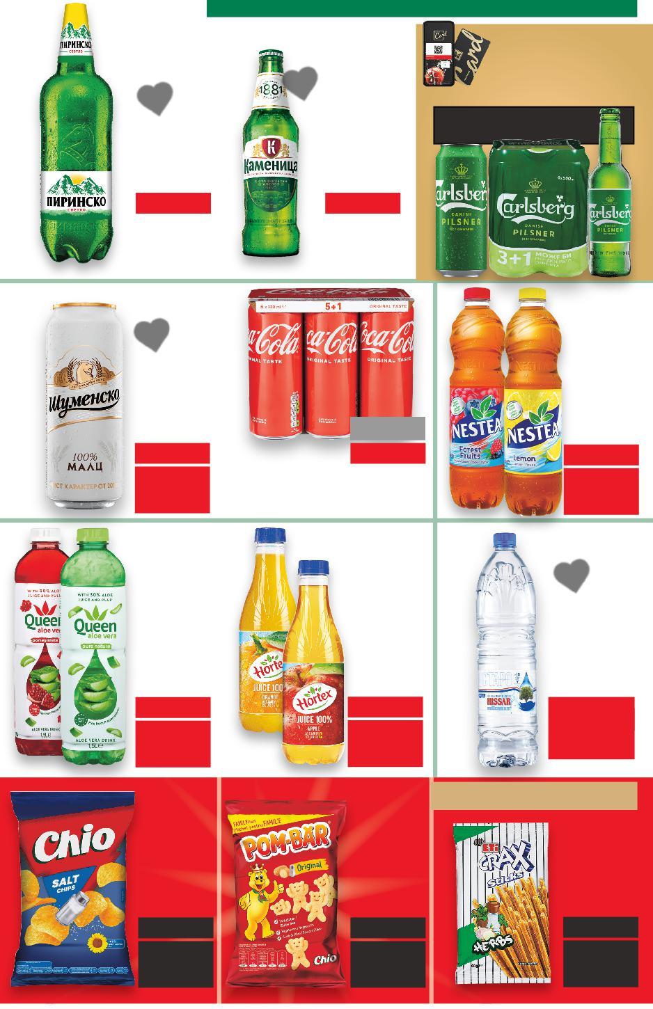 1 л (1 л = 11,99) NIVEA Дезодорант спрей различни видове 250 мл (1 л = 27,96) NUCREMA Какаов крем различни видове 1 кг (1 кг = 7,49) STAROPRAMEN Бира 5% vol 1 л РЕТ (1 л = 1,79) SNICKERS/ BOUNTY Шоколадов десерт 85 - 112 г (1 кг = от 17,77) SENSODYNE Паста за зъби 75 мл или Четка за зъби 1 бр. различни видове (1 л = 66,54)