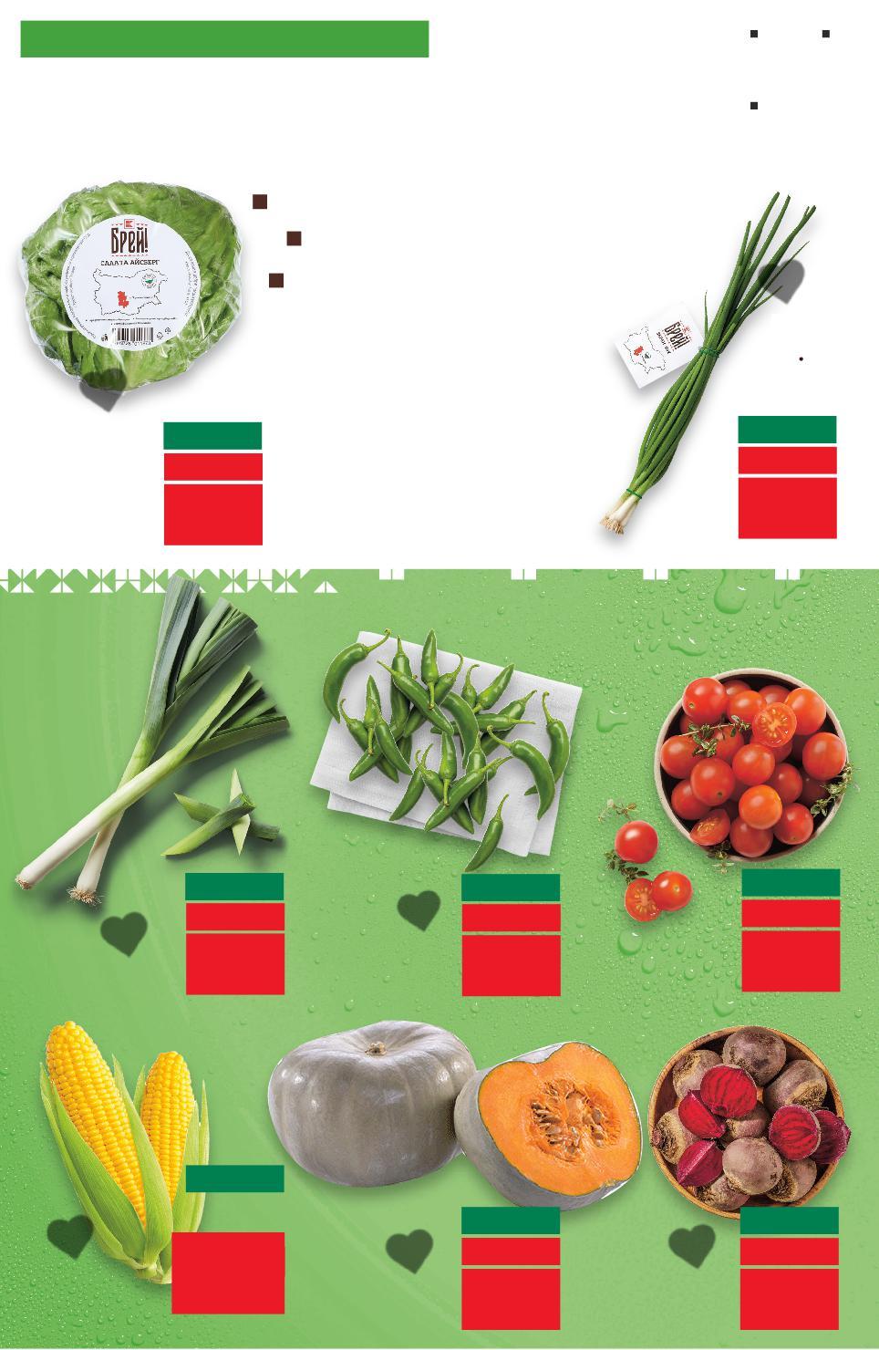 Цените са валидни за посочените на последна страница хипермаркети. Стоките се продават в количества, обичайни за едно домакинство. Всички цени са в лева с включен ДДС. Всички артикули се предлагат без декорация. Снимките са примерни. Виж как отглеждаме зеленчуците тази седмица тази седмица -40% 1,49 2,49 -25% 2,99 3,99 0,99 2,49 -35% 1,29 1,99 0,99 0,75 -24% -18% 4,49 5,49 -41% 1,29 2,19