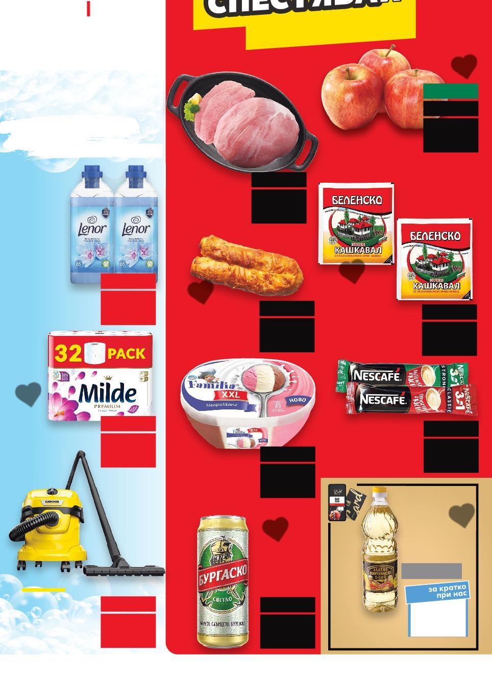 ДО 12 БРОЯ НА ПОКУПКА** БЕЛЕНСКО Кашкавал от краве мляко 2 х 400 г (1 кг = 13,74) НА ЦЕНАТА НА 1 ВЗЕМИ 2 Ябълки Гала кг LENOR Oмекотител или Парфюмни перли различни видове 2 х 1,2 - 1,625 л = 2 х 48 - 65 прaнета или 2 х 140 г (1 л = от 4,09) БУРГАСКО Бира 4,4% vol 0,5 л кен (1 л = 1,98) NESCAFE Разтворимо кафе 3 в 1 или 2 в 1 различни видове 8 - 17 г (1 бр. = 0,30) FAMILIA Сладолед различни вкусове 970 г/ 2000 мл (1 кг = 9,27) MILDE Тоалетна хартия Relax Purple трипластова 32 бр. (1 бр. = 0,61) Баничка различни видове от нашата пекарна 117 г (1 кг = 7,18) Свински бут без кост от нашата витрина кг (1 кг = 8,79) ЗЛАТНО ДОБРУДЖАНСКО Слънчогледово олио 1 л (1 л = 2,49) Цена с KAUFLAND CARD ВЗЕМИ ЧЕТЕН БРОЙ от тeзи артикули на половин цена. Клас: I 3 ГОДИНИ ГАРАНЦИЯ СТР. 22 - 29 СТР. 2 - 3 Цените са валидни от 28.08.2023 до 03.09.2023 или до изчерпване на наличностите. Стоките се продават в количества, обичайни за едно домакинство. Всички цени са в лева с включен ДДС. Цените са валидни за посочените на последна страница хипермаркети. Kaufland не носи отговорност за печатни грешки. Всички артикули се предлагат без декорация. Снимките са примерни. Предложенията може да видиш и на kaufland.bg. *Със звездичка са обозначени артикулите, които са специално предложение до изчерпване на наличностите. Всички Kaufland Card отстъпки са изчислени спрямо стандартната текуща цена, на която продуктът се предлага в хипермаркета. ОТ ПОНЕДЕЛНИК, 28.08.2023 ДО НЕДЕЛЯ, 03.09.2023 ! С KAUFLAND СПЕСТЯВАЙ ! ! S1-BG-KW35-LFT-TS-1000-10