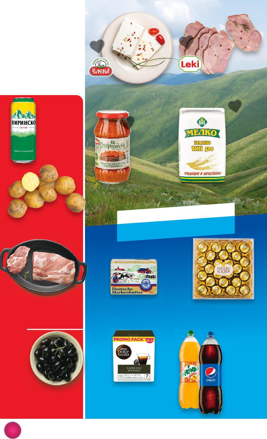 БЪЛГАРСКИ СВЕТОВНИ МАРКИ СПЕСТИ С -42% 7,99 13,99 -39% 8,49 13,99 -34% 1,69 2,59 -24% 6,99 9,29 -28% 9,89 13,89 -37% 4,99 7,99 -30% 13,85 19,79 -12% 1,45 1,65 -21% 14,99 18,99 -32% 1,69 2,49 2 литра 9,49* само 18 броя -27% 1,05 1,45 PEPSI/ MIRINDA/ 7 UP Газирана напитка различни видове 2 л РЕТ (1 л = 0,85) DERONI Староселска лютеница едросмляна 520 г (1 кг = 13,45) Свински врат варено-пушен от нашата витрина кг (1 кг = 9,89) DEUTSCHE MARKENBUTTER Краве масло 82% масленост 250 г (1 кг = 19,96) Черни маслини Супер, супер Мамут размер: 81/ 90 Произход: Гърция от нашата витрина кг (1 кг = 7,99) Свински врат без кост, цяло парче от нашата витрина кг (1 кг