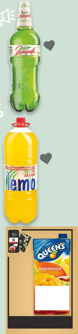 = 49,97) Пресни картофи Клас: I кг NESCAFE Кафе капсули Dolce Gusto различни видове 16 + 2 бр. в опаковка 197 - 262 г (1 бр. = 0,53) ПИРИНСКО Бира 4,4% vol 0,5 л кен (1 л = 2,10) ПРОМОПАКЕТ Цените са валидни от 27.02.2023 до 05.03.2023 или до изчерпване на наличностите. Стоките се продават в количества, обичайни за едно домакинство. Всички цени са в лева с включен ДДС. Цените са валидни