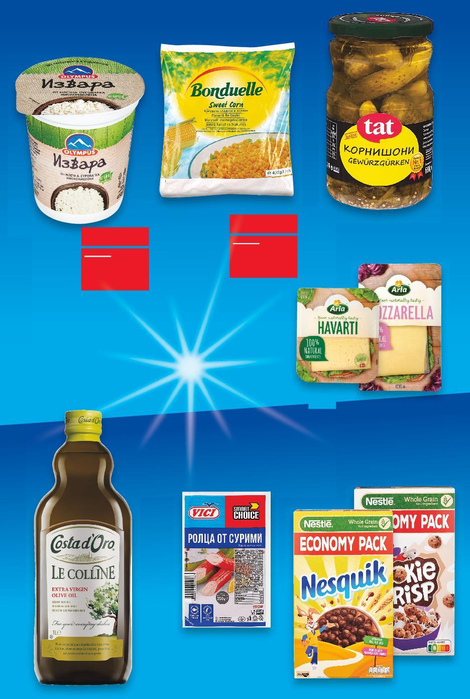 -26% 2,99 4,09 -25% 3,19 4,29 NESTLE Зърнена закуска различни видове 600 - 625 г (1 кг = от 11,19) VICI Ролца от сурими замразени 250 г (1 кг = 11,16) ARLA