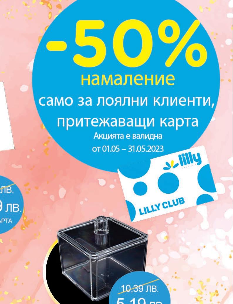 *Брошурата е за период от 01.05 до 31.05.2023 г. Предложенията в нея важат за посочения период или до изчерпване на наличните количества. *Артикулите от стр. 2 не се предлагат във всички обекти. Информация за артикулите, които не се предлагат във всички обекти, виж на стр. 40, QR код 1. *Всяко цветче ви носи 1 стотинка. Само с карта “LILLY CLUB”.