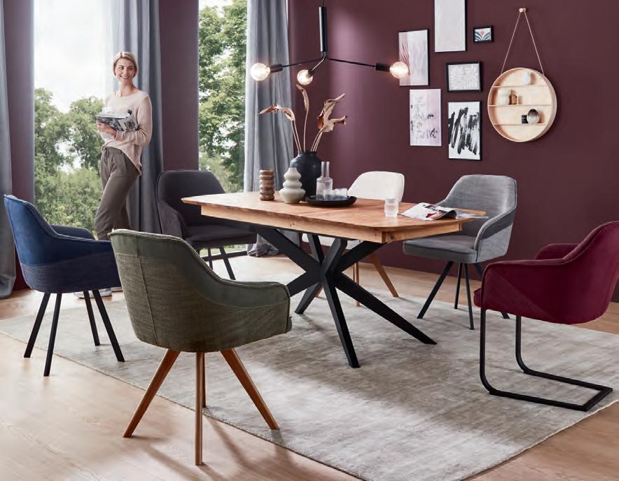 Esstisch Wildeiche massiv geölt, Gestell Metall schwarz, ca. 220 x 100 cm 27410292_01 3.999,- UVP 1.499,Armlehnstuhl strapazierfähiger Bezugsstoff in verschiedenen Farben erhältlich, Gestell in Edelstahl oder Schwarz erhältlich, drehbar 01960584_02-05 702,- UVP 229,-