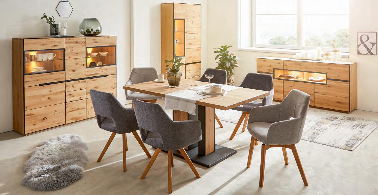 Esstisch Eiche massiv natur geölt, Gestell schwarz matt, ca. 200 x 100 cm 08980001_01 2.642,- UVP 799,Armlehnstuhl strapazierfähiger Bezugsstoff in verschiedenen Farben erhältlich, Gestell Wildeiche massiv geölt 17000127_03-06 481,- UVP 149,Gegen Mehrpreis: mit Drehfunktion erhältlich 17000127_01-02 548,- UVP 199,Highboard, Front Wildeiche massiv, Korpus Wildeiche furniert, Rahmen graphitschwarz, ca. 152 x 136 x 38 cm