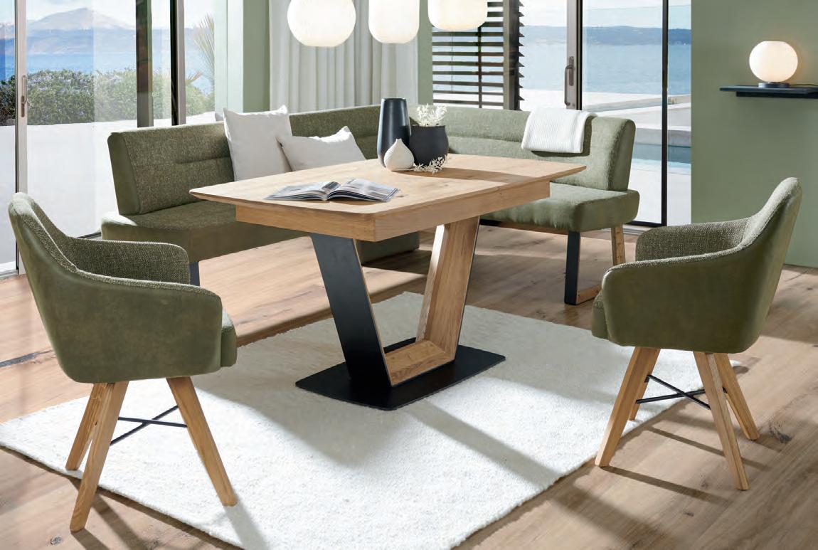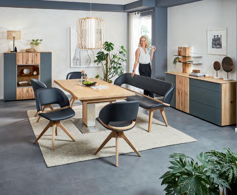 8: Esstisch Wildeiche massiv, Gestell Lack anthrazit, ca. 220 x 100 cm 01960855_01 3.083,- UVP 999,Sitzbank, Wildeiche massiv, Gestell Lack anthrazit, ca. 220 cm 01960855_02 1.289,- UVP 449,Armlehnstuhl, strapazierfähiger Bezugsstoff in verschiedenen Farben erhältlich, Gestell in Wildeiche massiv oder Buche natur Lack schwarz erhältlich 17000134_01-02 504,- UVP 179,Gegen Mehrpreis: Armlehnstuhl mit Drehfunktion erhältlich 17000134_03-04 564,- UVP 199,-