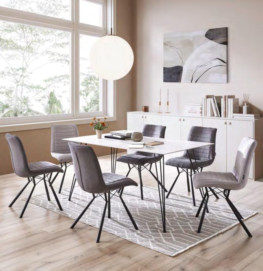 Esstisch preisgleich auch in Keramik grau erhältlich 00690103_02 885,- UVP 299,Stuhl, strapazierfähiger Bezugsstoff in Anth razit oder Hellgrau erhältlich, Gestell schwarz matt 27310007_01-02 242,- UVP 89,90