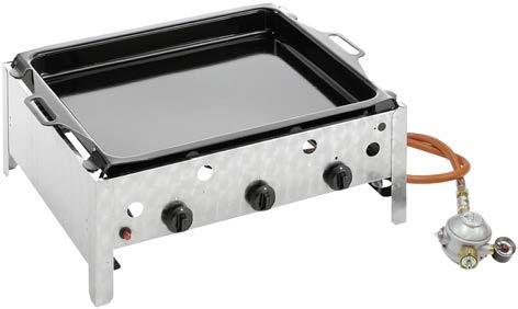 • Edelstahlgehäuse, mit Gasschlauch, Sicherheitsregler und Schlauchbruchsicherung