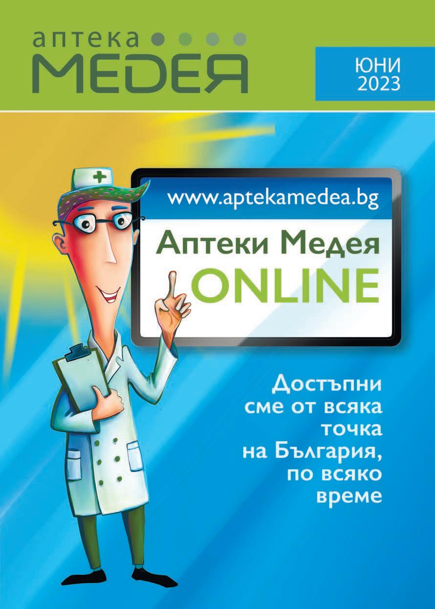Медея Кюстендил – гр. Кюстендил, ул. „Демокрация“ 38; тел.02 4 516 565 Предложенията са валидни за периода 01.06 - 30.06.2023 г. или до изчерпване на количествата. Цените са в български лева с включен ДДС. Верига аптеки Медея си запазва правото да променя цените в посочения период. Верига аптеки Медея не носи отговорност при допуснати печатни грешки. Някои от продуктите не се предлагат във всички обекти. Всички обекти приемат ваучери Содексо. Можете да зaплатите и със следните карти: Следвайте ни във Facebook /aptekamedea или на адрес: www.aptekamedea.bg