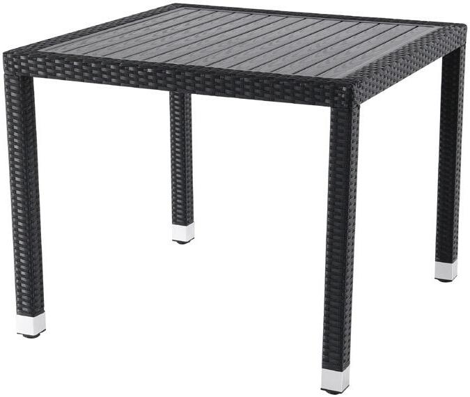 • Aluminiumgestell mit wetterbeständigem Kunststoffrattan, Tischoberfläche aus AluminiumLatten in Holzoptik
