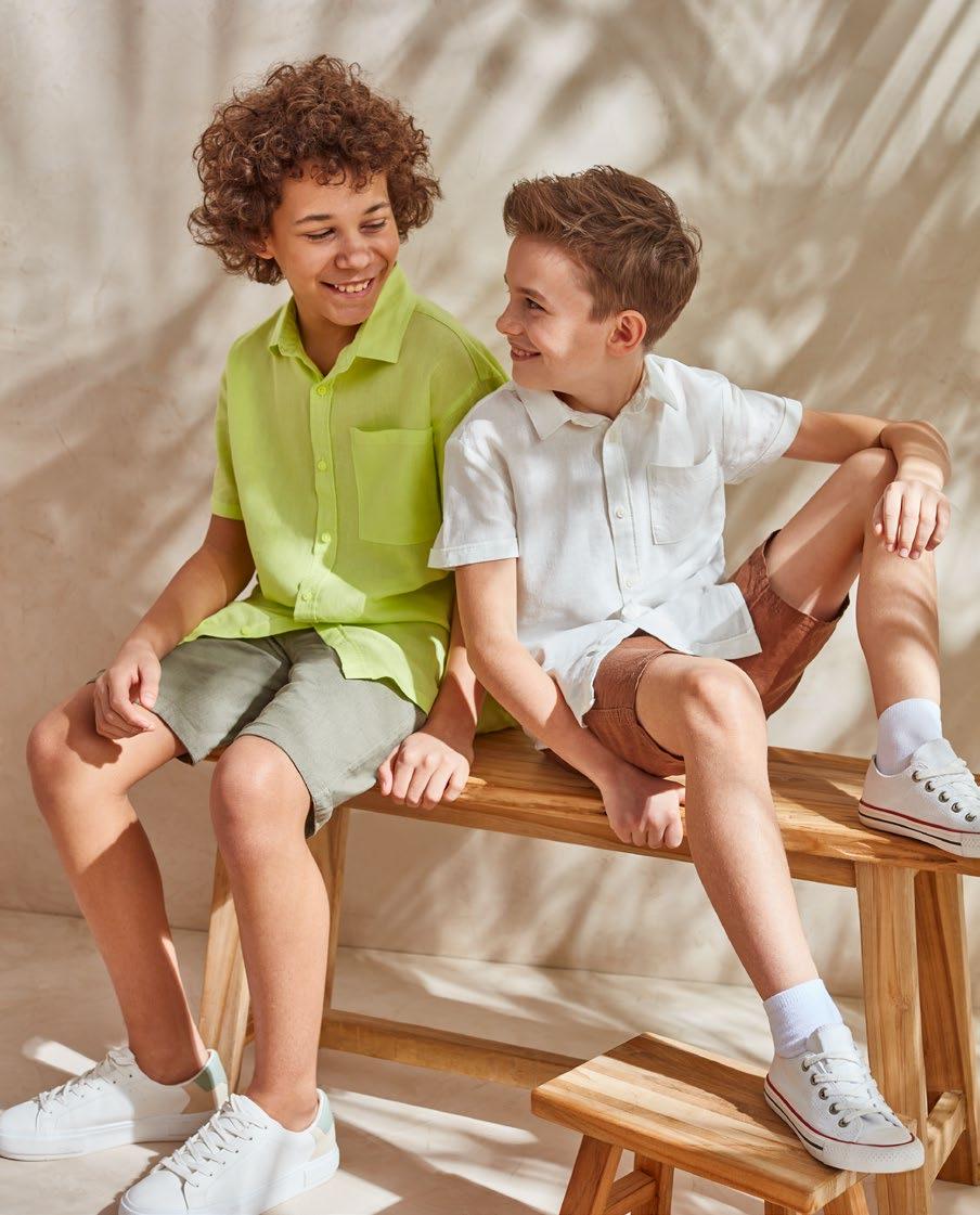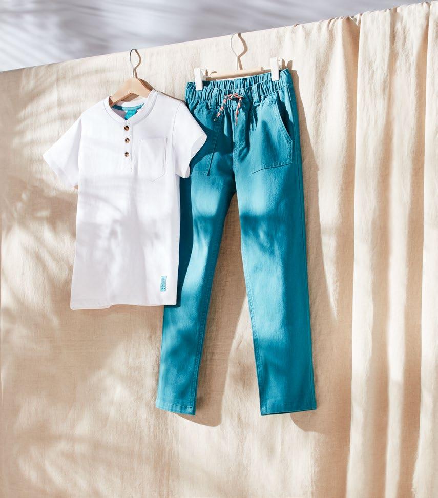 98% памук и 2% еластан, за момчета, с връзки на талията и пришити джобове, размери: 104-134 см