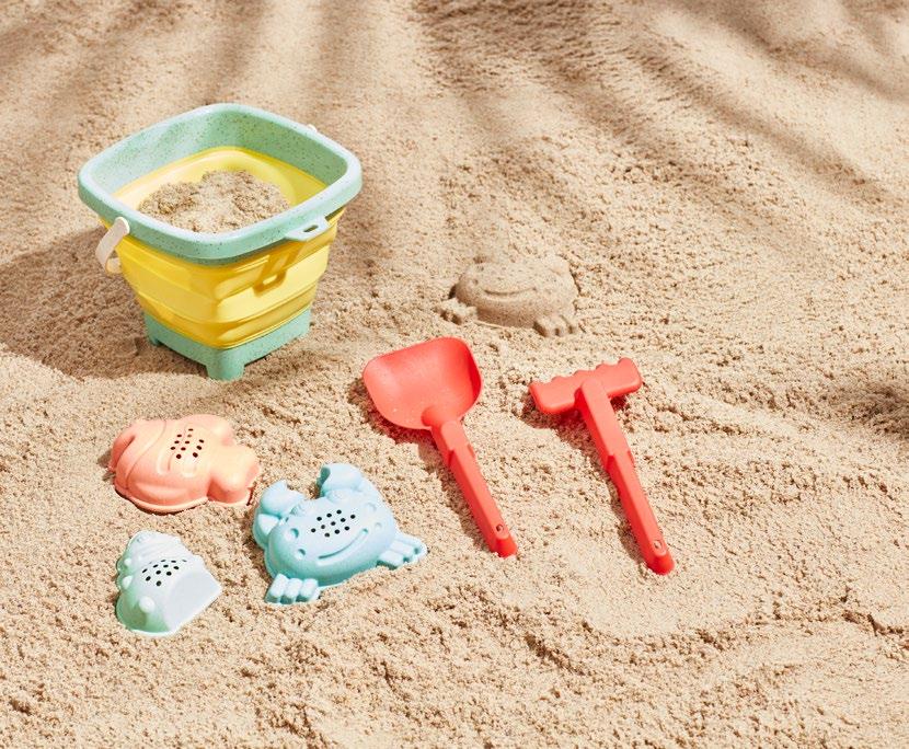 за пясък, 6 части пластмаса с добавени естествени материали, включва: сгъваема кофичка, гребло, лопатка и 3 формички с дупки, за деца на възраст над 12 месеца
