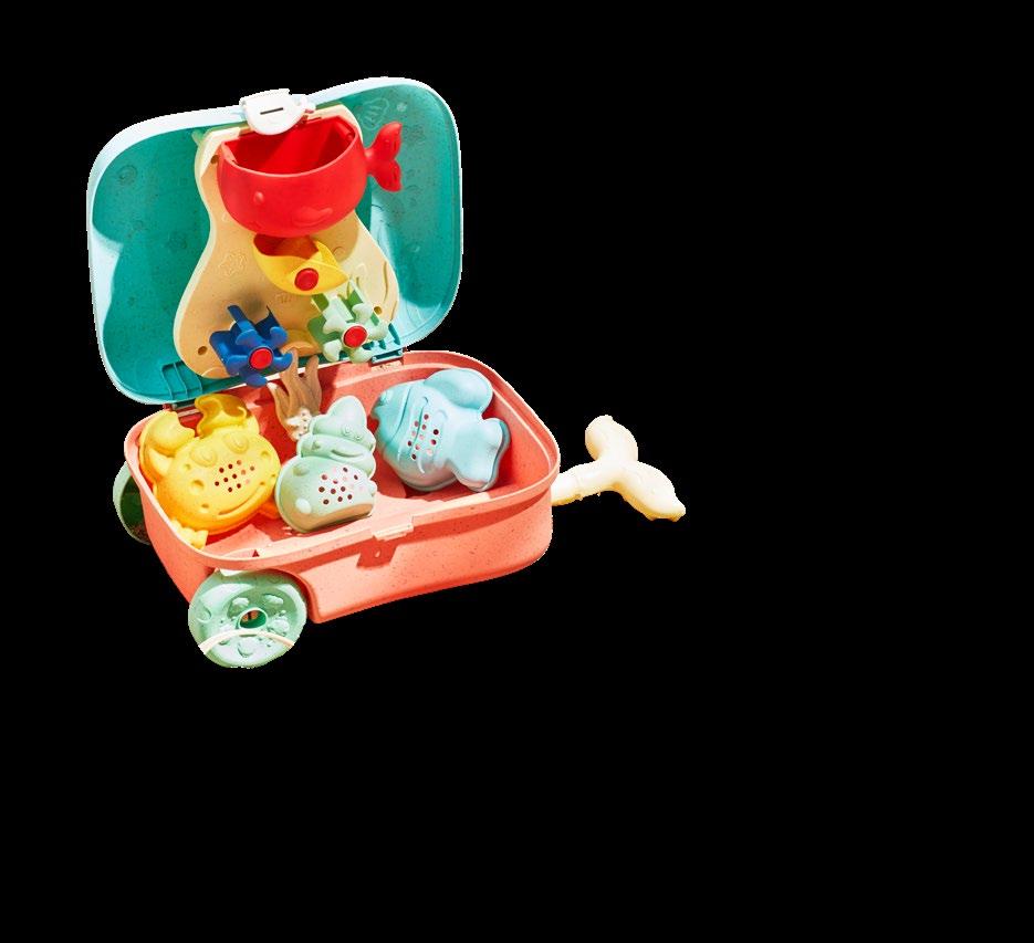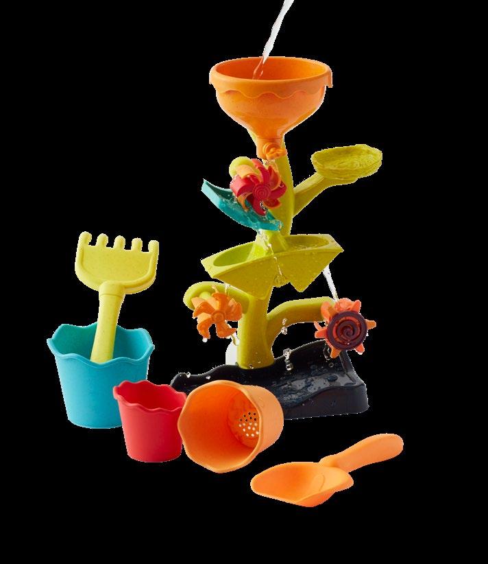 пластмаса с добавени естествени материали, комплектът включва: фонтан, гребло, лопатка и 3 формички с дупки, за деца на възраст над 18 месеца