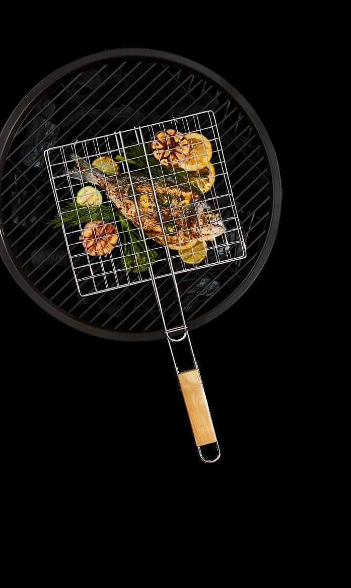 Скара за грил метална, от хром, отваряема, за лесно обръщане, с дървена дръжка, размери: 54 х 27 см