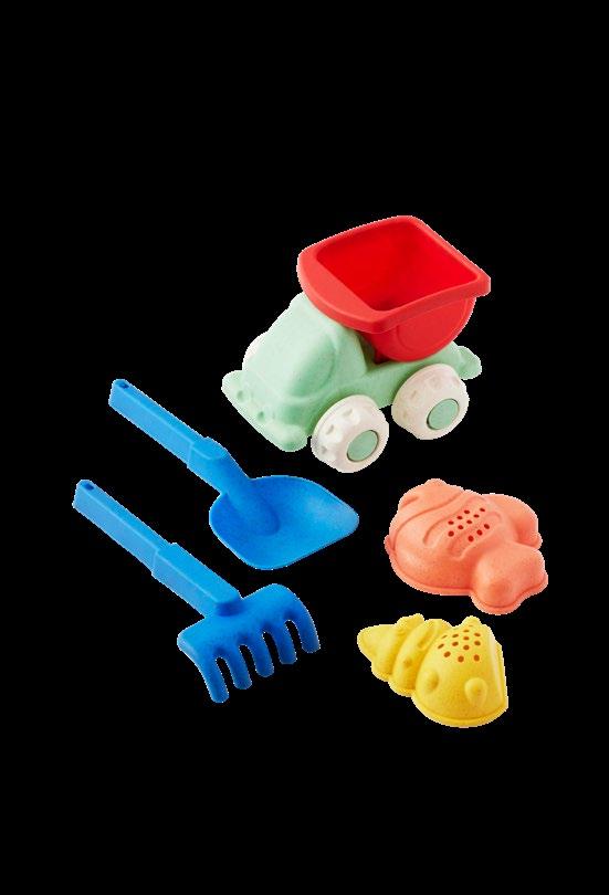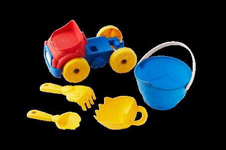 пластмаса с добавени естествени материали, включва: самосвал, гребло, лопатка и 2 формички с дупки, за деца на възраст над 12 месеца