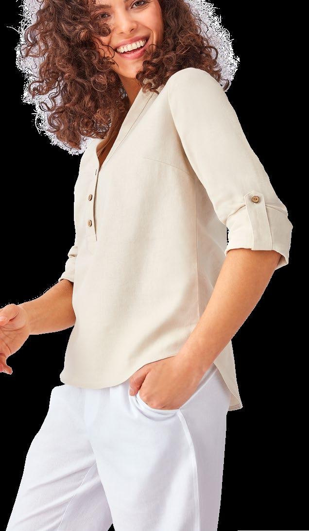 от вискоза и лен, дамска, с яка, с V-образно деколте с копчета и копчета за подвиване на ръкавите, размери: 36-46