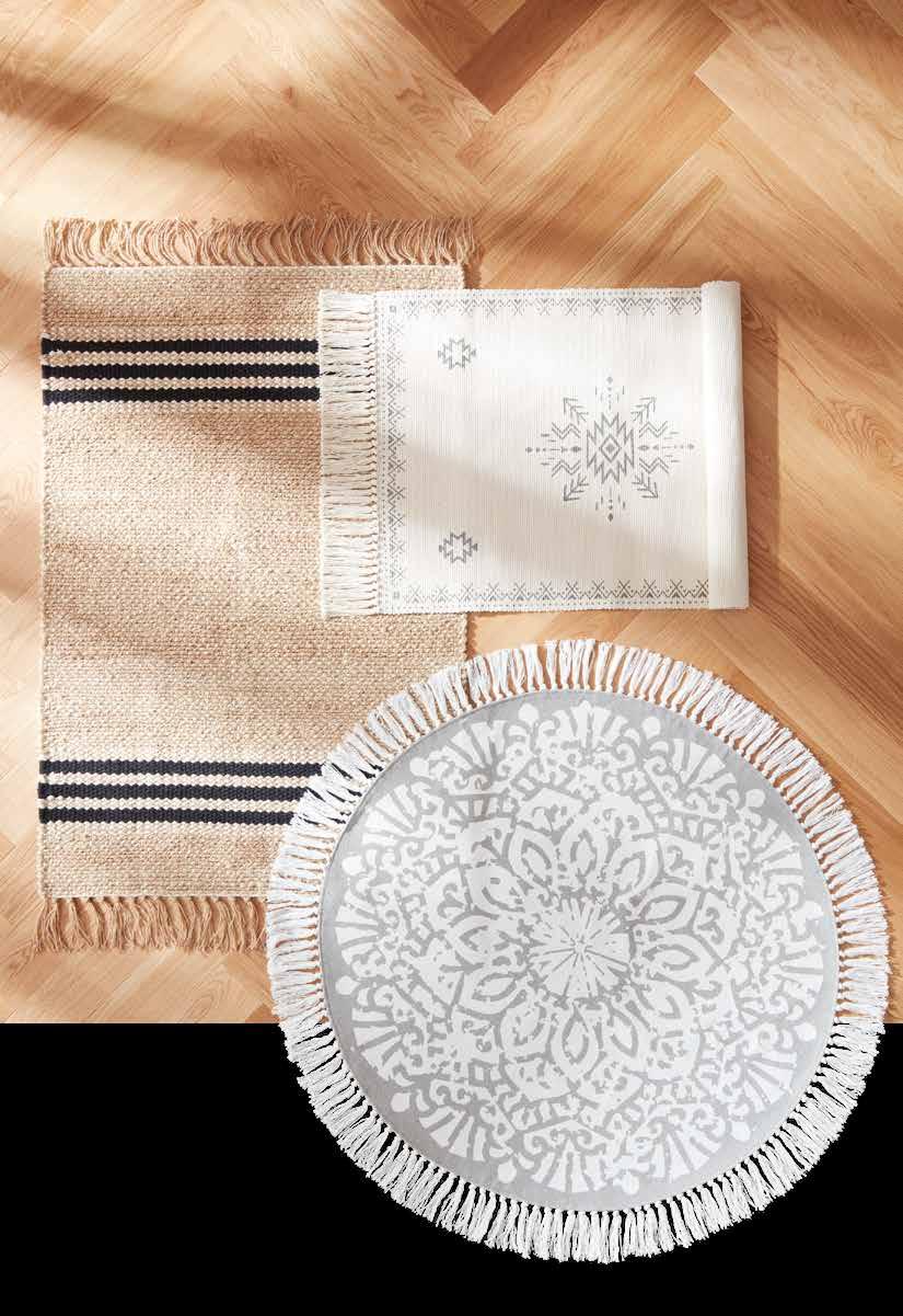 Jute, gestreift, Maße: 80 x 120 cm – 15 € Baumwolle, rund, ø 100 cm – 15 €