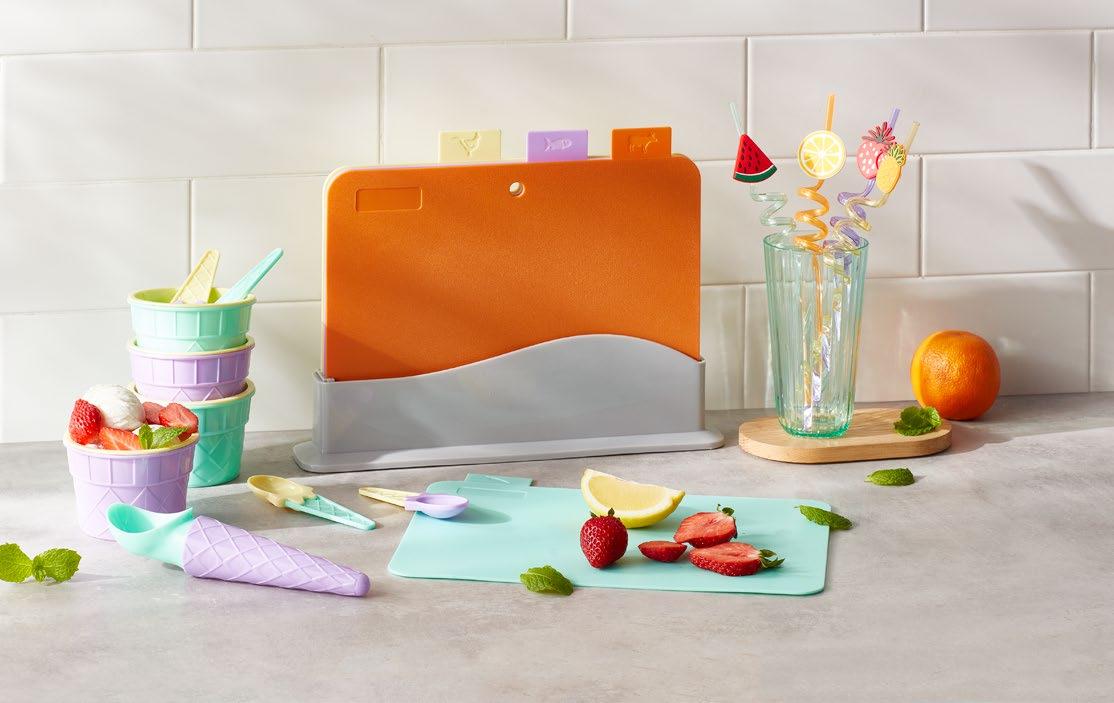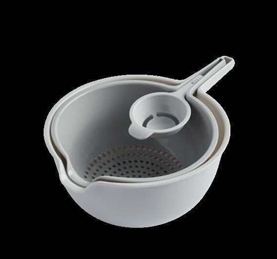 включва: купа, ø 23 см, височина: 12 см, гевгир, ø 20,5 см, височина: 10,5 см, цедка, дължина с дръжката 15 см, ø 8 см, височина: 3 см