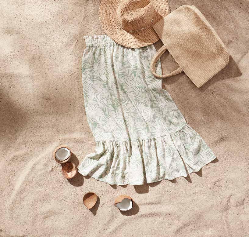 Rock 100% Viskose mit breitem Gummibund, Rüschen am Saum und Aufdruck, Größen: S–XXL
