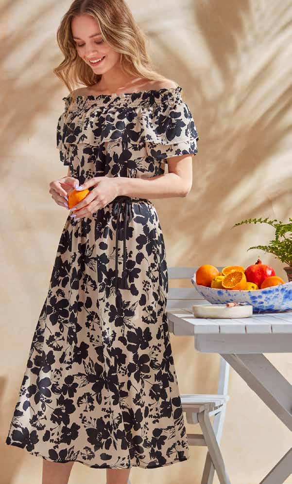 Kleid 100% Viskose mit Aufdruck und gebundenem Gürtel zur Betonung der Taille, Größen: 36–44