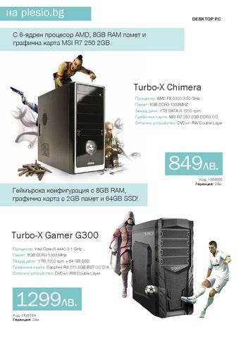 Turbo-X Gamer G300 Процесор: Intel Core i5 4440 3.1 GHz Памет: 8GB DDR3 1333 MHz Твърд диск: 1 TB 7200 rpm + 64 GB SSD Графична карта: Sapphire R9 270 2GB BST OC D-X Оптично устройство: DVD+/- RW Double Layer