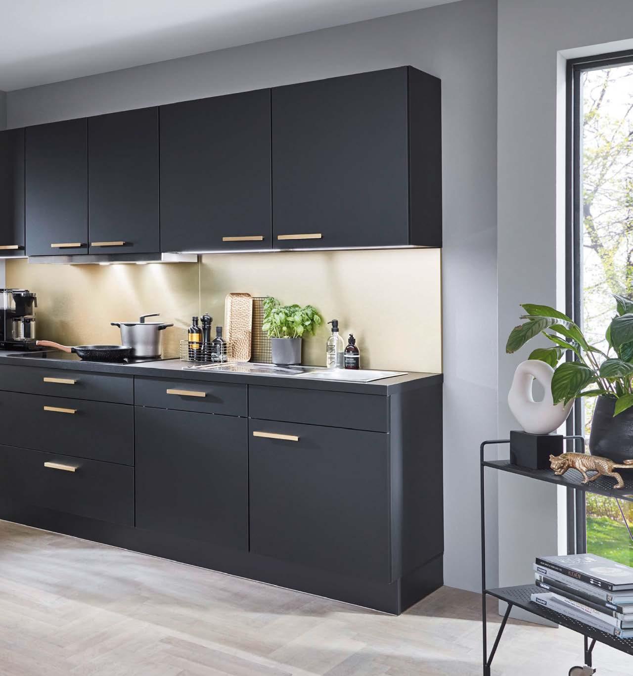 Doppelblock Touch ca. 150 und 260 cm, Front: Lacklaminat, Schwarz supermatt, Korpus: Schiefergrau, Absetzungen in Gold Optik, Geräte-Abb. ähnlich, Beleuchtung, Spüle und Nischenrückwand gegen Mehrpreis 5099126/00