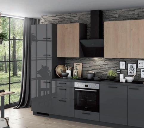 ca. 200 x 280 cm, Front: Grauschiefer Nachbildung/Nussbaum Nachbildung, Korpus: schwarz, Geräte-Abb. ähnlich, Geschirrspüler, Armatur und Nischenrückwände gegen