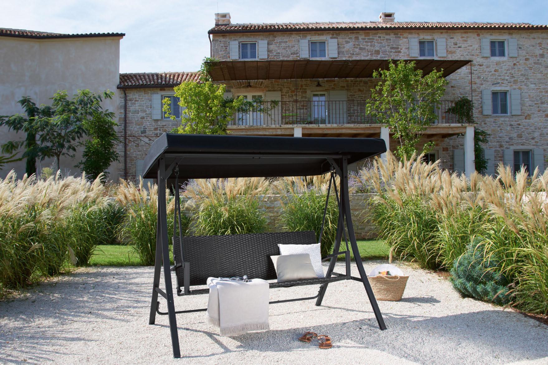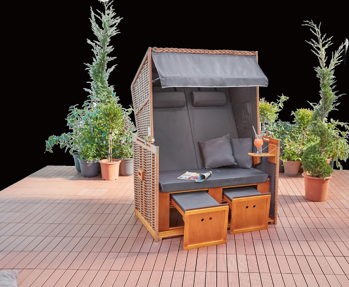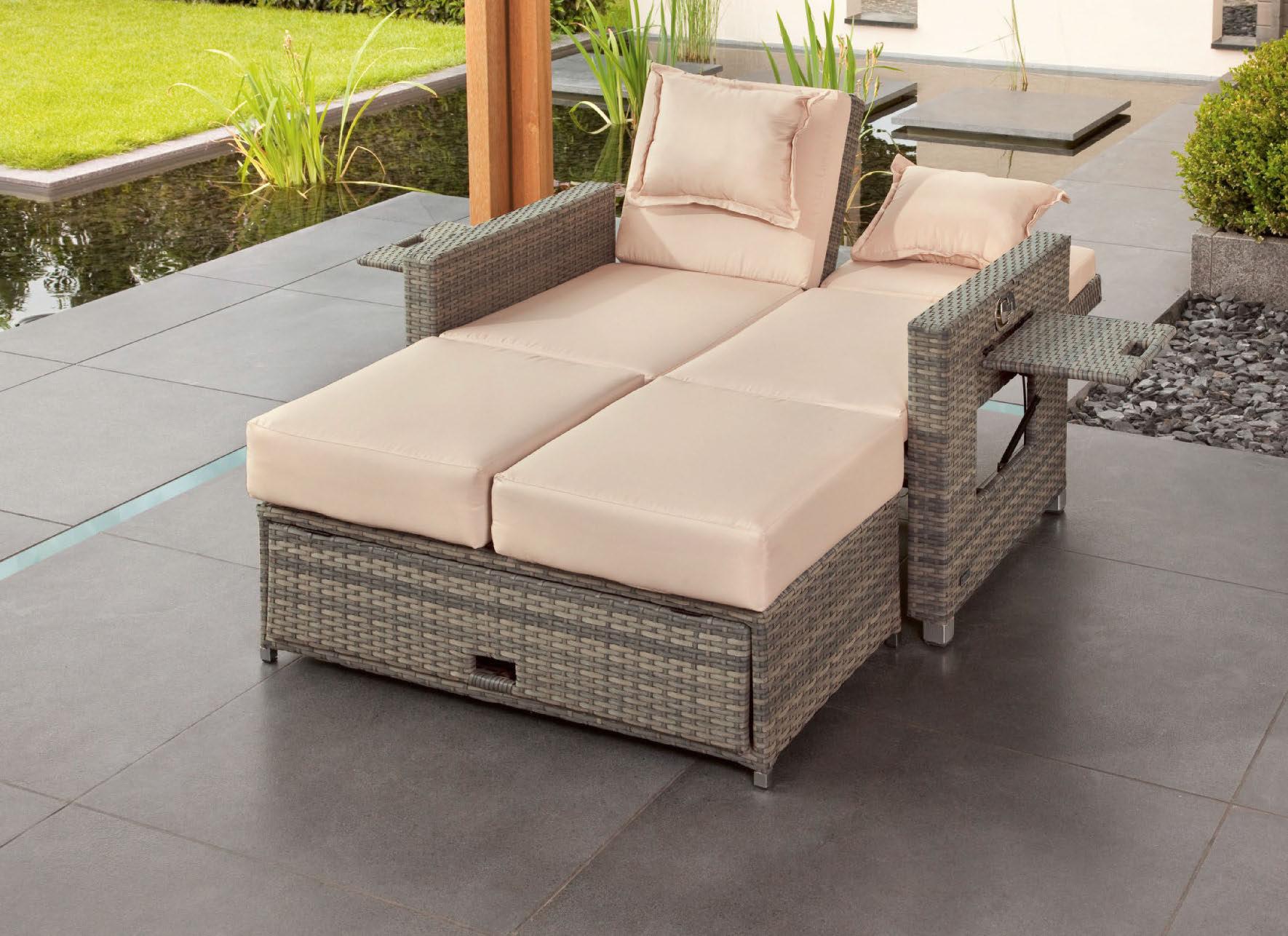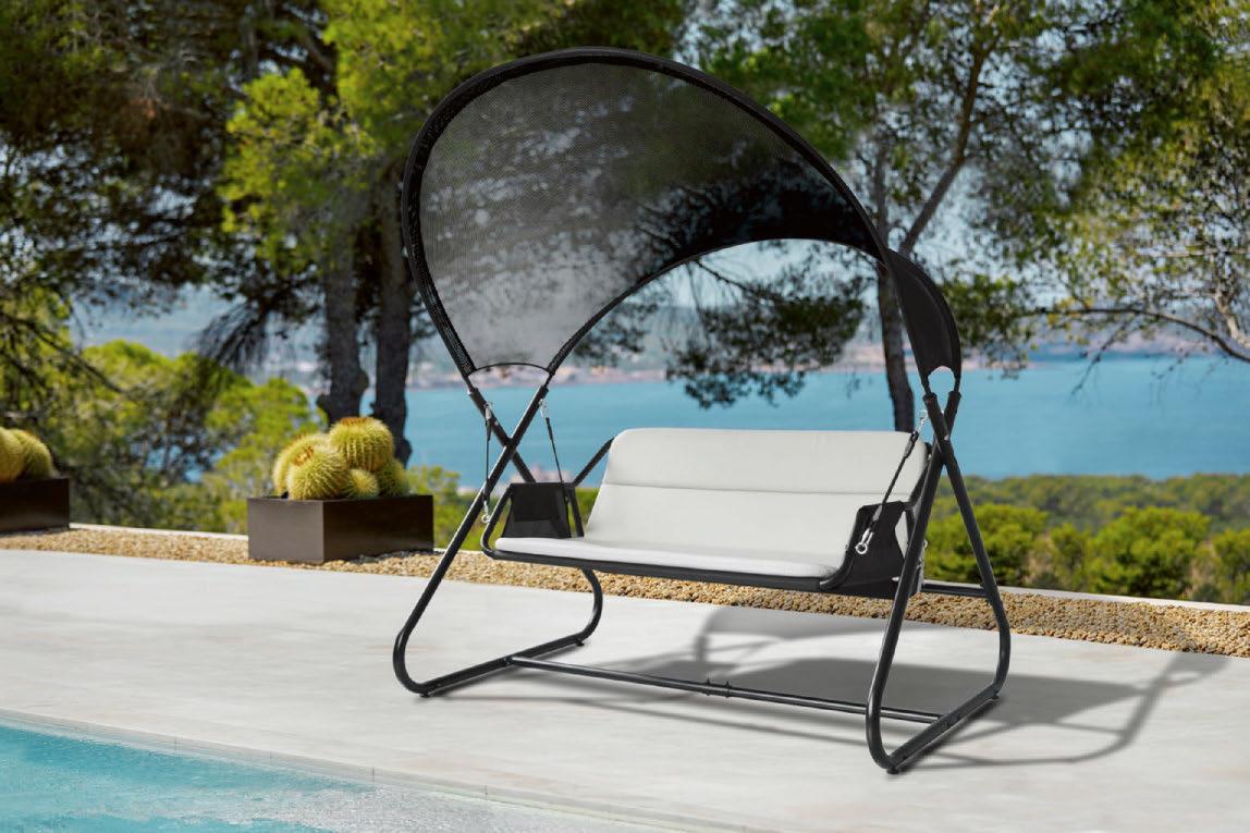 Stahl, Polyethylen, Polyester, ca. 118 x 99 x 86 cm mit Liegefäche: ca. 180 x 44 x 102 cm