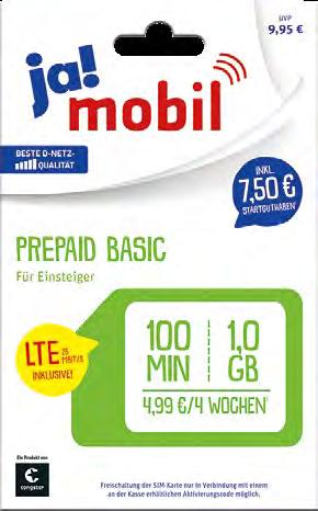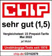 des Extra-Startguthabens ist ausgeschlossen. Die Aufbuchung erfolgt spätestens 14 Tage nach Erhalt unserer Bestätigungs-SMS. Weitere Infos unter www.jamobil.de. Leistungserbringer und Vertragspartner der ja! mobil Mobilfunkdienstleistung ist ausschließlich die congstar Services GmbH, Bayenwerft 12-14, 50678 Köln. Bis zu 23 € Startguthaben!* ja! mobil Kunde werden und bis zu 23 € Startguthaben erhalten. laut Chip, Ausgabe 5/2022 20 € Startguthaben statt 10 €* 23 € Startguthaben statt 13 €* 17.50 € Startguthaben statt 7.50 €*