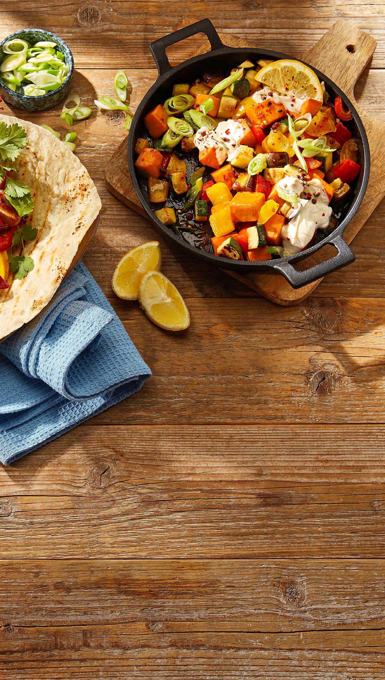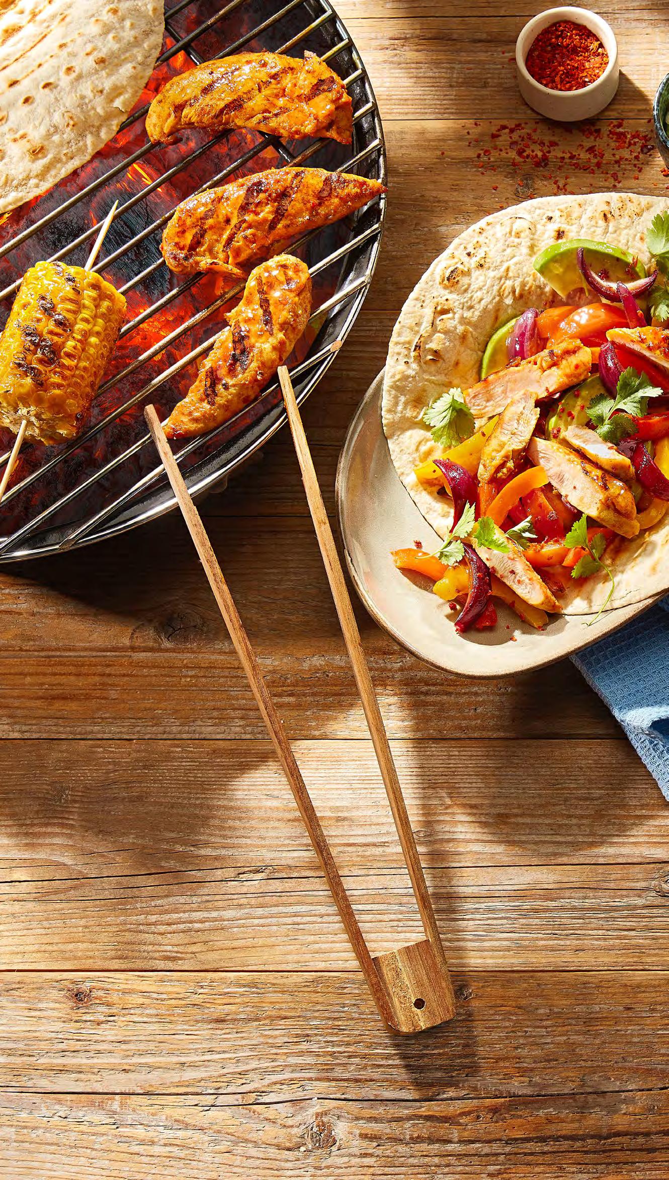 1. Grill vorheizen, Zwiebel schälen und in Spalten schneiden. Paprika waschen, entkernen und in Streifen schneiden. Zwiebel und Paprika mit Öl vermischen und in einer nachhaltigen Grillschale 10–15 Min. grillen.