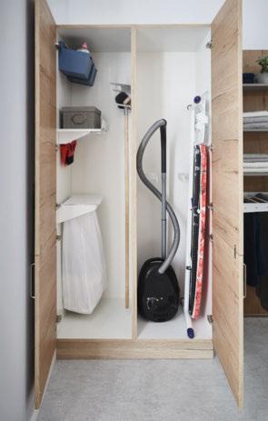 Der Unterschrank punktet mit Wäschekorb-Tablaren inklusive entnehmbarer Körbe. Der Hochschrank entpuppt sich als Ordnungssystem.
