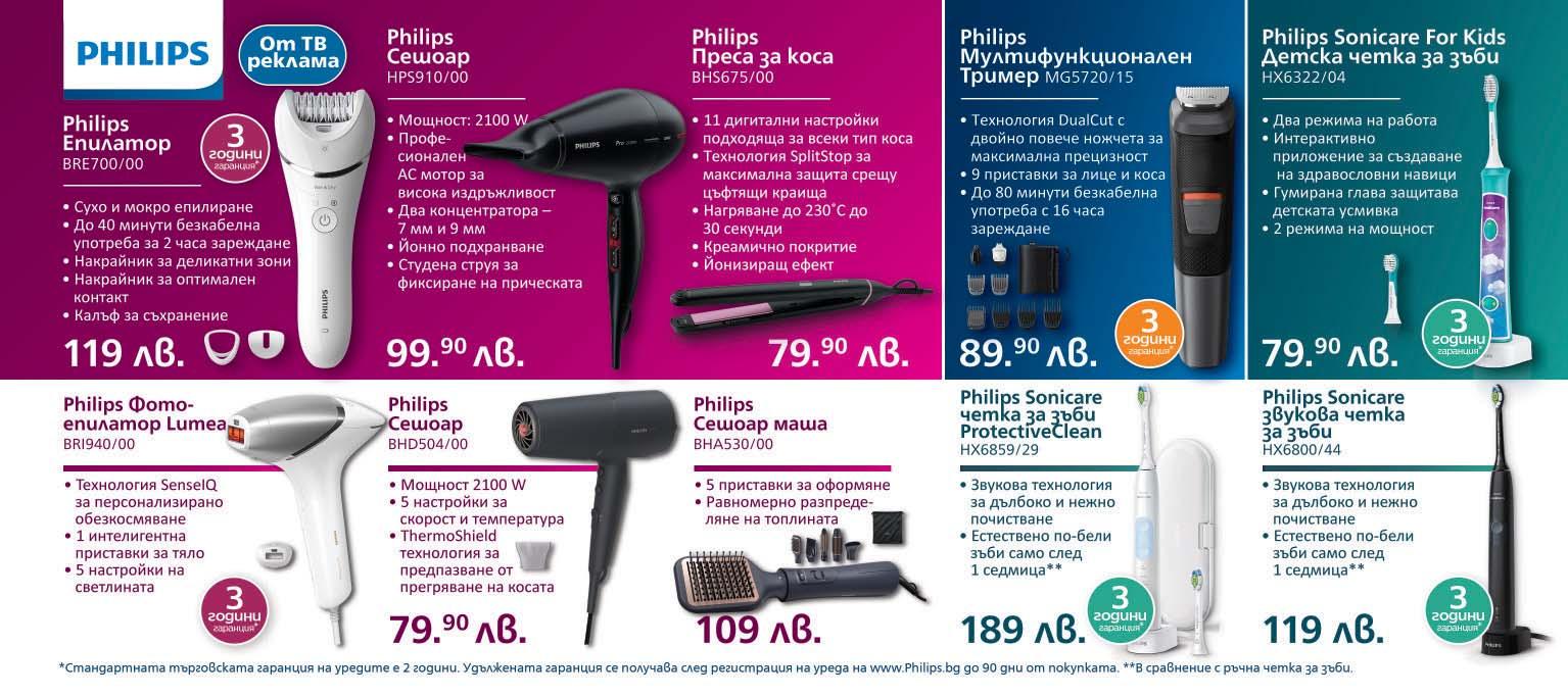 G спести до Вземи ОТСТЪПКА при покупка на 4 или повече уреда *Прогнозата е за годишно спестяване на разходите за електроенергия на битов потребител, при използване на избрани домакински ел ектроуреди с по-висок енергиен клас, сравнено с използването на същия тип избрани електроуреди с по-нисък енергиен клас. Прогнозата е на база собствено проучване на актуална към момента на публикуване публично достъпна информация за 2022 г./2023 г. и данни от енергийния етикет, предоставени от производителя, при изследване на времеви и/или количествени критерии и използване на определени функции на уредите. Възможно е посочените параметри да претърпят промени. ОТ СМЕТКИТЕ ЗА ЕЛЕКТРИЧЕСТВО Подмени уредите вкъщи с ВИСОК КЛАС ЕНЕРГОСПЕСТЯВАЩИ 99.90 10 x 74.90 749.12 91.58 1099.12 91.58 1099.6 x 91.50 549.10 84.90 849.6 53.17 319.6 66.50 399.6 58.17 349.6 x 43.17 259.6 49.83 299.L'Oréal STEAMPOD 3.0 Преса за коса • Непрекъснат поток от пара • Перфектно изправяне на косата и лесно оформяне на къдрици • Автоматично нагаждане на температурата • Вграден гребен 6 x 86.50 519.10 x 89.90 899.S8590 KERATIN THERAPY PRO Преса за коса • Керамични плочи с кератин • Температура 230 С • Загряване до 15 секунди • Сезнор за защита от топлина S8500GP Shine Therapy Giftpack Комплект сешоар и преса • Преса: Дигитален температурен дисплей, 9 настройки 150°C - 230°C • Сешоар: • Генератор на йони • 2300W 119.CI9132 E51 PRO-LUXE Маша за коса • Интелигентната технология optiheat разпределя топлината точно там, където е необходимо 79.90 74.90 HG2000 E51 TRIMMER Face Тример • 7 приставки • 100% водоустойчив • Време за работа 40 мин ES-LT67-A803 Електрическа самобръсначка • Работа без кабел • За сухо и мокро ползване • Сензорна технология за брада • Глава Multi-flex 12D • Автономна работа 50мин 249.PL5154 WAT/GOLD 2/13 Фотоепилатор • 10 степени • 400000 импулса • 3 приставки • Сензор SMARTSKIN 229.- 159.- 129.SE 5-885 BS Епилатор с четка за лице • Работа без кабел до 30 мин • Технология SensoSmart™ • 2степени и масажиращ накрайник ES-EL7A-S503 Епилатор • За сухо и мокро ползване • Гъвкава въртяща се на 90° глава •Два диска с 60 пинсети •LED лампа 59.90 SE 1170 Епилатор • 20 пинсети • Система за повдигане на косъмчетата • 1 скорост • Работа с кабел BT5522/15 Тример • Работа с и без кабел • 40 настройки между 0.2 Мм и 10 мм • 3 гребена и прецизен тример • Време за зареждане 1 час • Бързо зареждане 5 мин • Автономна работа 120 мин • Калъф за съхранение 65.90 HYBRID LED Машинка за подстригване • 8 приставки за дължина • Работа на ток и батерия • Издръжливост на батерията 40мин Цените са в лева с ДДС.