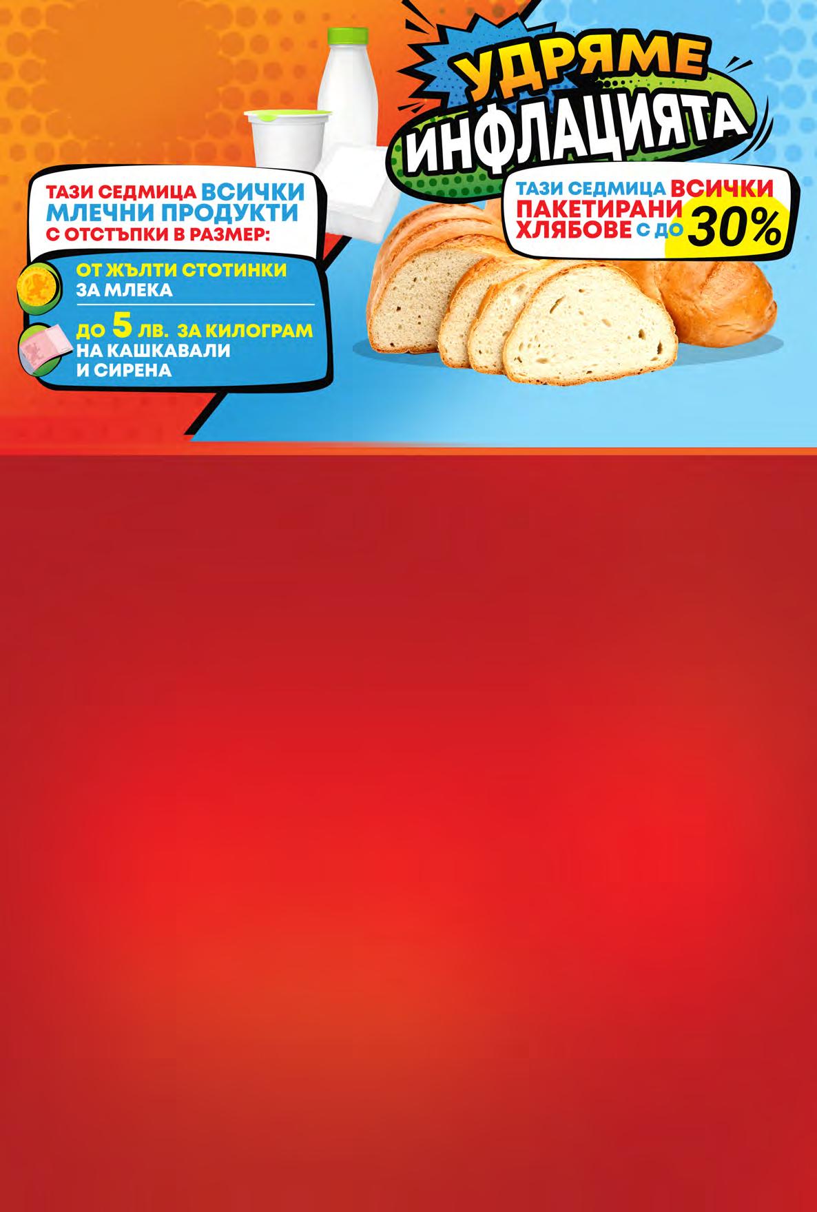 5 от вторник 08.11. до 14.11.2022 МЛЕЧНИ ПРОДУКТИ от вторник 28.02. до 06.03.2023 Моцарела „FORMAGIA” 125 г САМО 239 Кашкавал от краве мляко „СОКОЛОВО” вакуум, кг САМО 1299 Топено сирене „FIVEPI” слайс, различни видове, 120 г САМО 299 СПЕЦИАЛНИ ДНИ НА *не важи за стоки, участващи в други промоции -20% Всички продукти с марка „БУЛГАРЧЕ” Краве сирене „САЯНА” БДС, 800 г САМО 1499 САМО 359 Продукт за мазане „BELLA” с масло, 35%, 400 г Прясно мляко „ВЕРЕЯ” Чудно, 3,7 %, 1 л САМО 259 Кисело