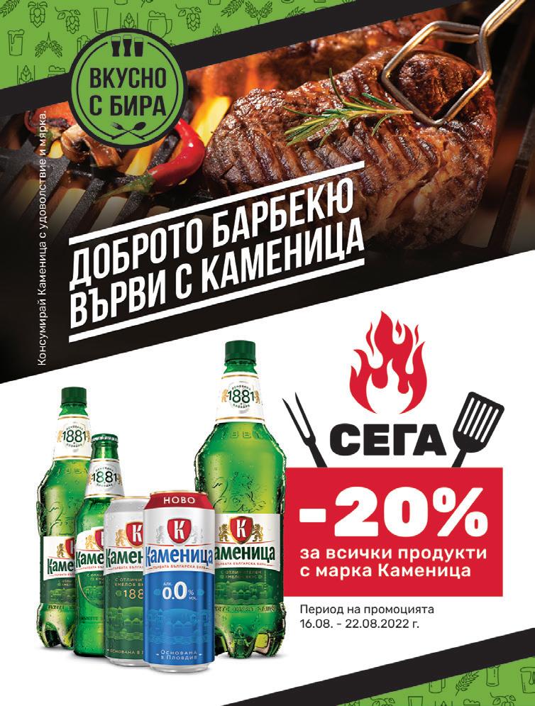 от вторник 16.08. до 22.08.2022АЛКОХОЛНИ НАПИТКИ *не важи за стоки, участващи в други промоции „TCHERGA”Вино 750сортове,различнимл -18% 810,9999 11 „ВиноSOPHIA 12%,червенобяло,3л -15% 79,4999 *не важи за стоки, участващи в други промоции видовеВсички мента и мастика с марка „ПЕЩЕРА” -20% сводкавидовеВсичкимарка „PLATINIUM” *не важи за стоки, участващи в други промоции „БираZATECKYHUS” кен, 5%, 500 мл -21% 11,6529 „СайдерSOMERSBY” 330видове,различнимл -32% 11,7519 -20% сспиртнаВсичкинапиткамарка „гроздоваЯМБОЛСКА” *не важи за стоки, участващи в други промоции „БърбънJIMBEAM” 70040%,мл -32% 1827,9999 „ДЯДОВАРакия УСУКАНИЦА” 40%,гроздова,700мл -15% 1113,9989 -20% -27% 1015,1999Узо„PARALIA” 70040%,мл
