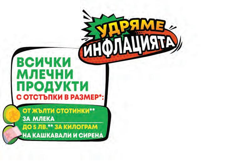 КУЛИНАРИЯ И ОЩЕ от вторник 22.08. до 28.08.2023 Сладолед „NUII” различни видове, 66 - 68 г (1 кг = до 45,31 лв.) -38% 4,89 299 Кюфте бюрек бр. -25% 1,19 089 -25% 3,99 299 Замразена пица „MEGA DI CATO ” различни видове, 310 - 325 г (1 кг = до 9,65 лв.) Замразени картофи „TOP MANIA” 1 кг -20% 4,99 399 Точени кори „ФАМИЛИЯ” 500 г (1 кг = 5,98 лв.) -25% 3,99 299 -25% Всички видове маслини от витрината с обслужване Не важи за стоки, участващи в други промоции. *Не важи за магазини: гр. София, кв. Борово до бл. 232, кв. Редута ул. Атанас Узунов 14, кв. Редута, ул. Велчо Атанасов 27; гр. Пловдив, район Централен, ул. Капитан Райчо 32, бл.16, ет.1 Салата „ХУМУС” различни видове, 200-250 г (1 кг = до 11,95 лв.) САМО 239 Салата Европейска кг САМО 899 -25% 26,99 1999 Свински печени уши кг „ФОРНЕТТИ” Макси пица, шунка, бр. -23% 1,29 099 ОТ НАШИЯ ХЛЕБЕН БАР Ориз с гъби кг -28% 6,99 499 Мусака кг САМО 999 Пилешки шиш** бр. САМО 189 Салата целина, моркови и чушки кг -16% 11,99 999 **Не важи за магазини: гр. София, ж.к. Лозенец, ул. Персенк 22, бл. 34; кв. Борово до бл. 232; кв. Редута ул.Атанас Узунов 14; кв. Редута, ул. Велчо Атанасов 27; гр. Пловдив, бул. Васил Левски № 3, ет. 1, обект маг. 2 ; район Централен, ул. Капитан Райчо 32, бл. 16, ет. 1. Пилешки крила* мариновани, печени, бр. -33% 1,19 079 САМО
