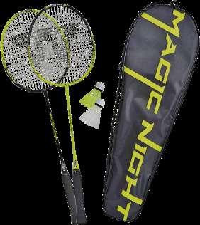bestehend aus 2 Badmintonschlägern aus gehärtetem Stahl, geschlossenes T-Stück, hart bespannte multifile Saite, Ösen, 2 Kunststoffbälle inkl LED-Licht in der Dose, mit Ein- und Ausschalter, (Brenndauer je Ball ca 48 Stunden) inkl Tragetasche mit Reißverschluss