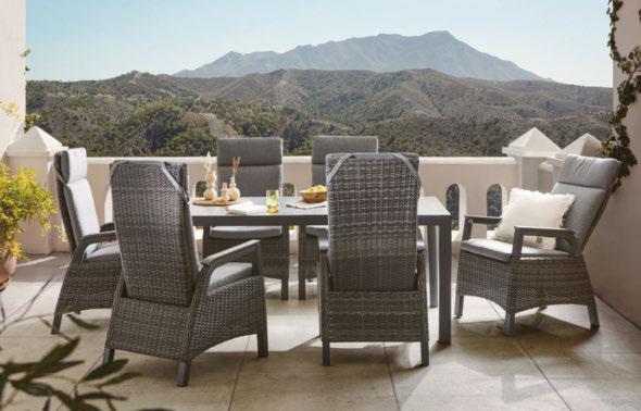 2: Gartentisch, Keramikplatte Holzoptik grau, Gestell Aluminium anthrazit, ca. 180 x 100 x 74 cm 13760002_07 599,- Garten-Relaxsessel, Auflagen dunkelgrau, Geflecht dunkelgrau, Gestell Aluminium anthrazit, Rückenlehne verstellbar, ca. 61 x 107 x 75 cm 13760002_01 319,verstellbar/abklappbar