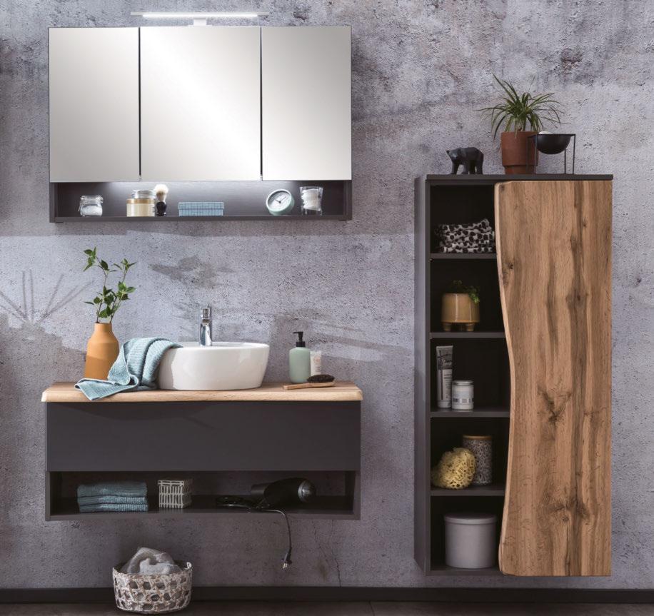 Badprogramm Bogen, Front matt grau/ wotaneiche, Korpus graphit, Waschtischkombination bestehend aus: Keramikaufsatzbecken, Waschbeckenunterschrank mit einzugsgedämpfter Schublade und offenen Fach, 03070143_01 1.127,- 399,Spiegelschrank 3-türig, 1 offenes Fach, inkl. LED-Aufsatzbeleuchtung, Schalter-/ Steckdosenelement, Breite ca. 100 cm 03070143_02 573,- 269,-