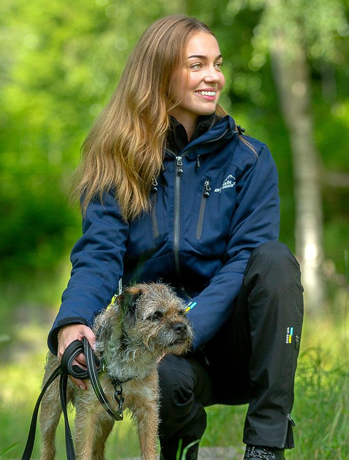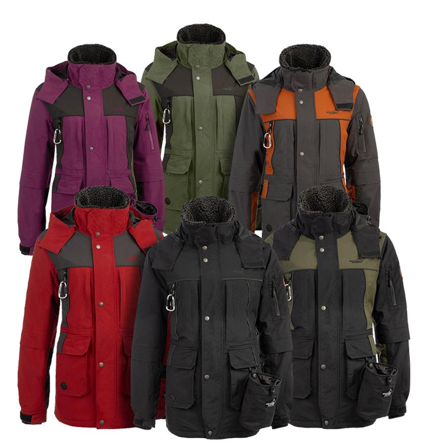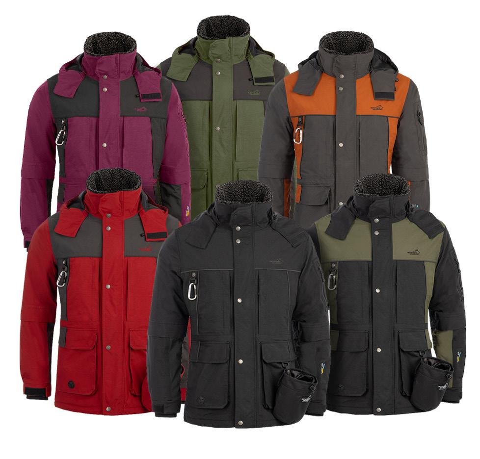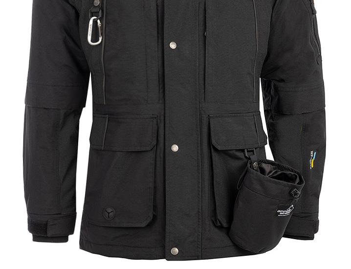 A lot of practical pockets. A large back pocket with zip, 2 chest pockets with pockets on the side with a zipper. At the bottom, large pockets with zippockets on the side. The lower left pocket is also lined inside with waterproof nylon lining to facilitate cleaning if you have dog candy in the pocket. 2 large inner pockets in polyester mesh. 2-way front zipper. Adjustable hood. Adjustable velcro ends in the sleeves. Practical D-ring with carabiner.