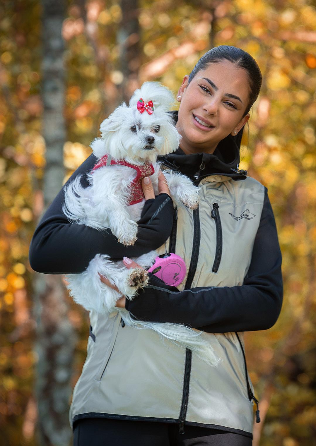 Lightly padded, the jacket is designed for year-round use. The collar is lined with soft teddy fleece for extra comfort. The adjustable hood is detachable, and the reflective details on the sleeves can be folded out when needed. There are also reflective elements on both the front and back for increased visibility. A large rear pocket with zipper provides extra storage. On the front, there are eight pockets, including four hand-warmer pockets lined with microfleece — perfect for cold days. One of the lower pockets includes a removable treat pocket, which can also be attached to a belt and used separately. There is also a dispenser opening for dog waste bags in the lower right front pocket.