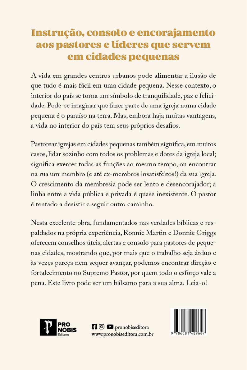 Se você está pastoreando em uma pequena cidade ou tem lutado com o chamado para isso, Ronnie Martin e Donnie Griggs serão companheiros valiosos. Escrevendo como pessoas que vivem essa realidade, eles são brutalmente honestos sobre as dificuldades, mas também profundamente encorajadores ao nos levarem a olhar para Aquele que amou e se entregou também pelas pessoas das cidades pequenas.