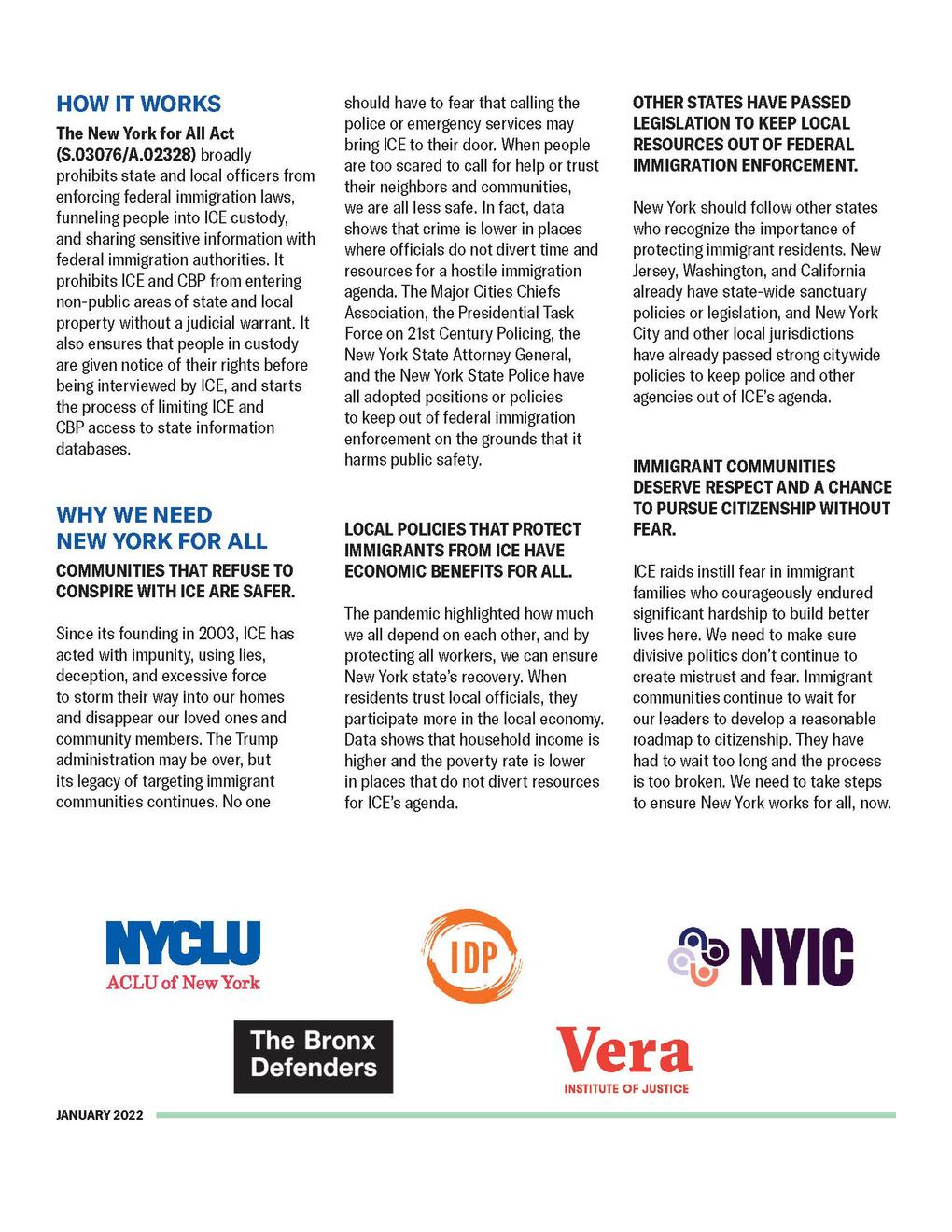 Pass the New York for All Act (S. /A. ) which broadly prohibits state and local officers from enforcing federal immigration laws, funneling people into ICE custody, and sharing sensitive information with ICE.