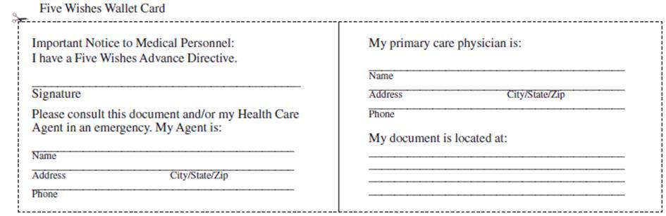 • Make copies of your completed Five Wishes for your family, friends, Health Care Agent and doctor