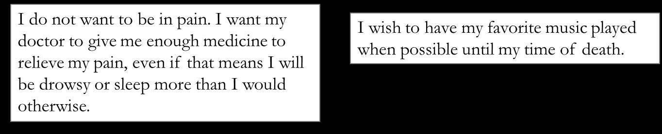 • Expresses instructions for your caregiver, such as the need to take medicine for pain, even if it leaves you sleepy
