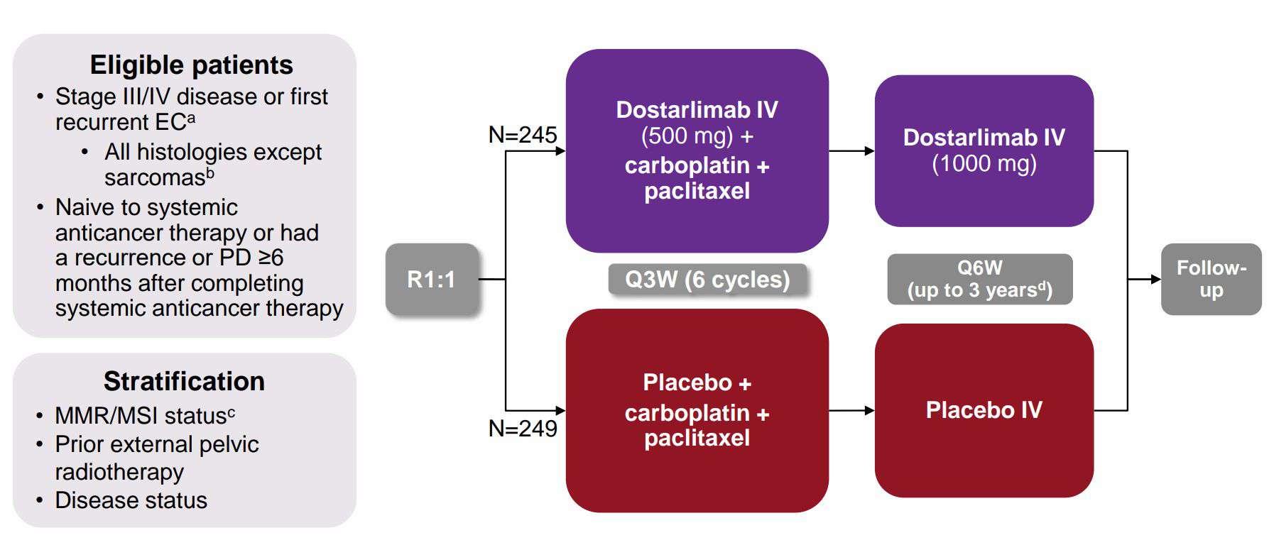 Mirza MR, Chase DM, Slomovitz BM. Dostarlimab for primary advanced or recurrent endometrial cancer. NEJM 2023;388:2145-2158.