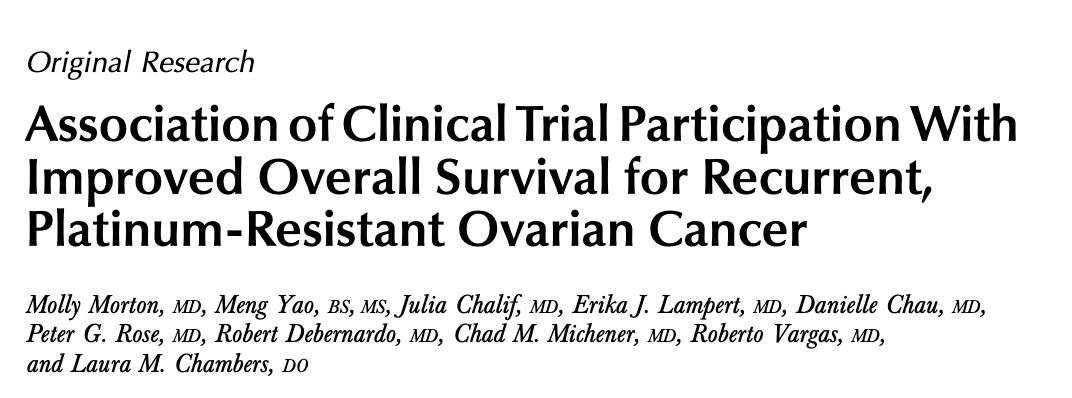 Morton M, Yao M, Chalif J, et al. Association of clinical trial participation with improved overall survival for recurrent, platinum-resistant ovarian cancer. Obstet Gynecol 2023;142(3):459-466.