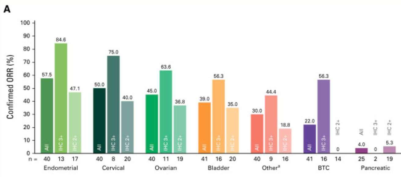 Meric-Bernstam F, Makker V, Oaknin A, et al. Efficacy and safety of trastuzumab deruxtecan in patents with HER2-expressing solid tumors: Primary results from the DESTINY-PanTumor02 phase II trial. J Clin Oncol 2024;42(1):47-58.